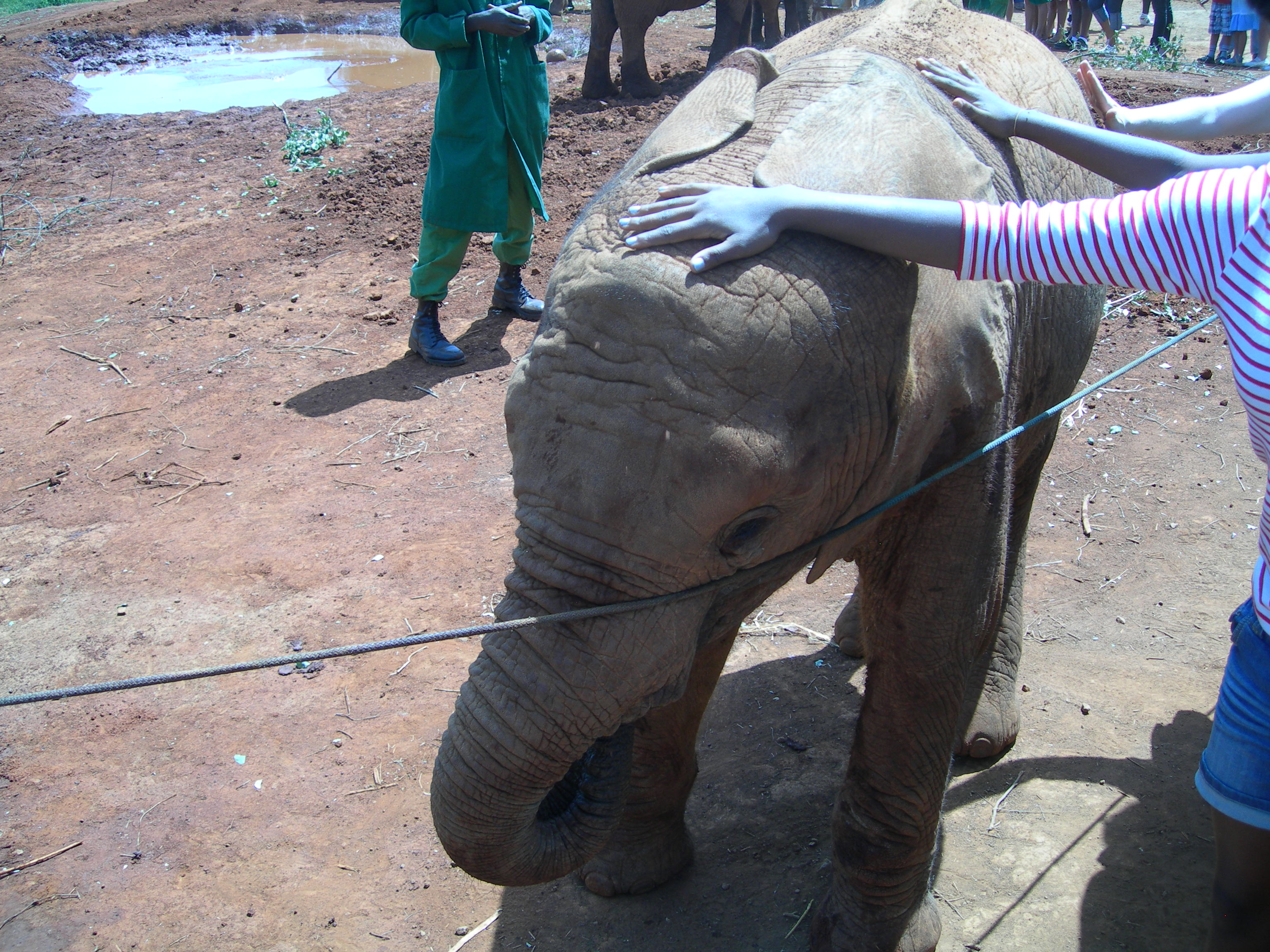 Když se některé ze slůňat přiblíží k provazu, děti k němu natahují nadšeně ruce. Nenechte se mýlit zkreslenými barvami v záběru proti slunci, i tohle slůně je obalené červeným mazlavým bahnem z jezírka a děti mají čistě vyprané a vyžehlené sváteční oblečky.