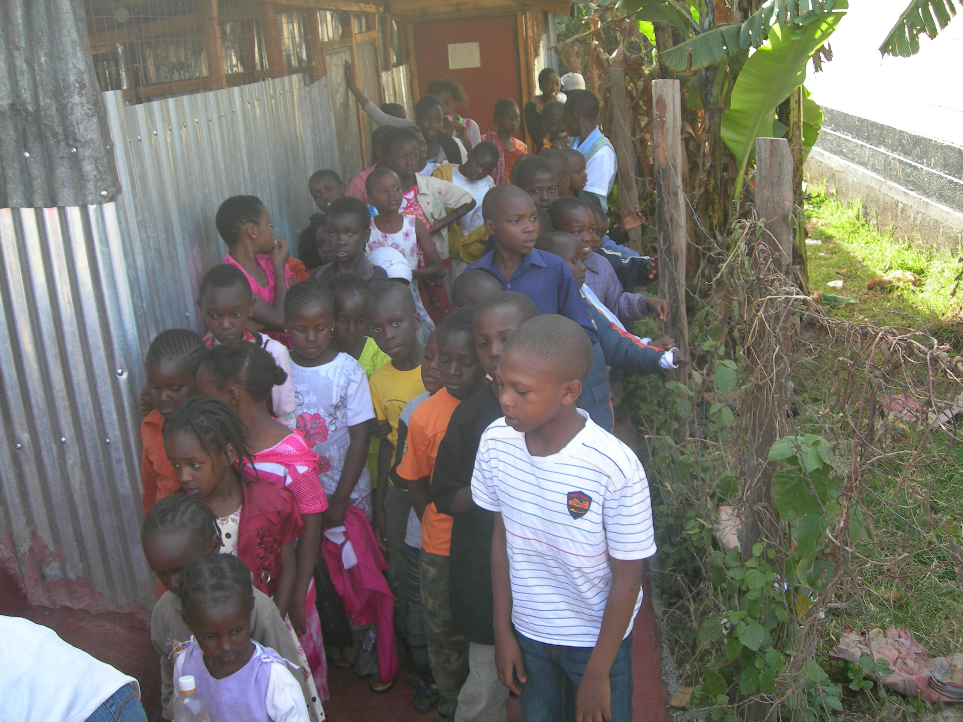 A už jsme kompletní. Junioři srovnají děti u vchodu do školky do dvouřadu...