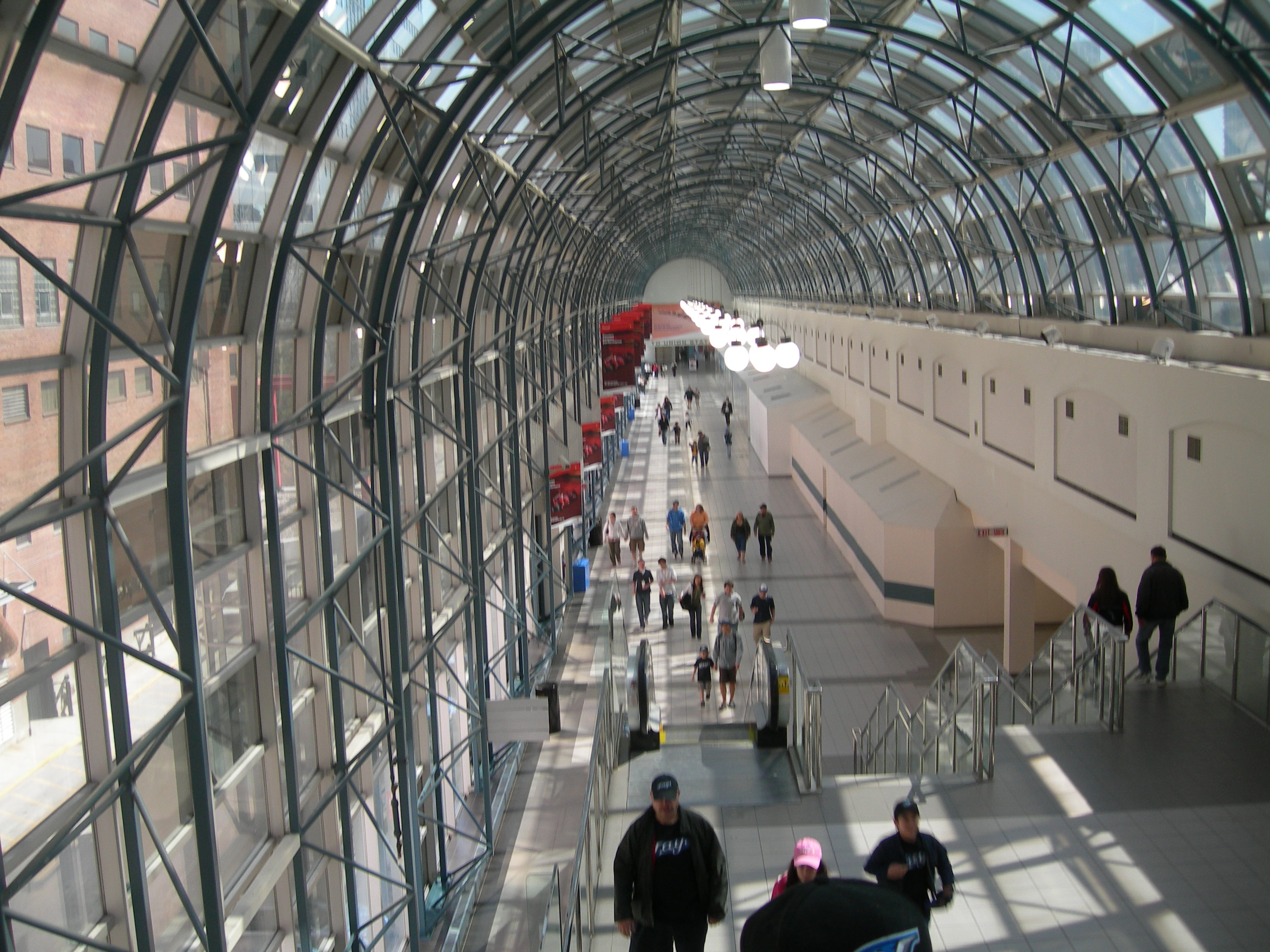 Neděli mám volnou poprvé za poslední dva měsíce, a tak vyrážíme s Allanem na baseball. Metrem jsme dojeli na hlavní nádraží a odtud jdeme takovýmhle nadchodem směrem k Torontské věži a ke stadionu.