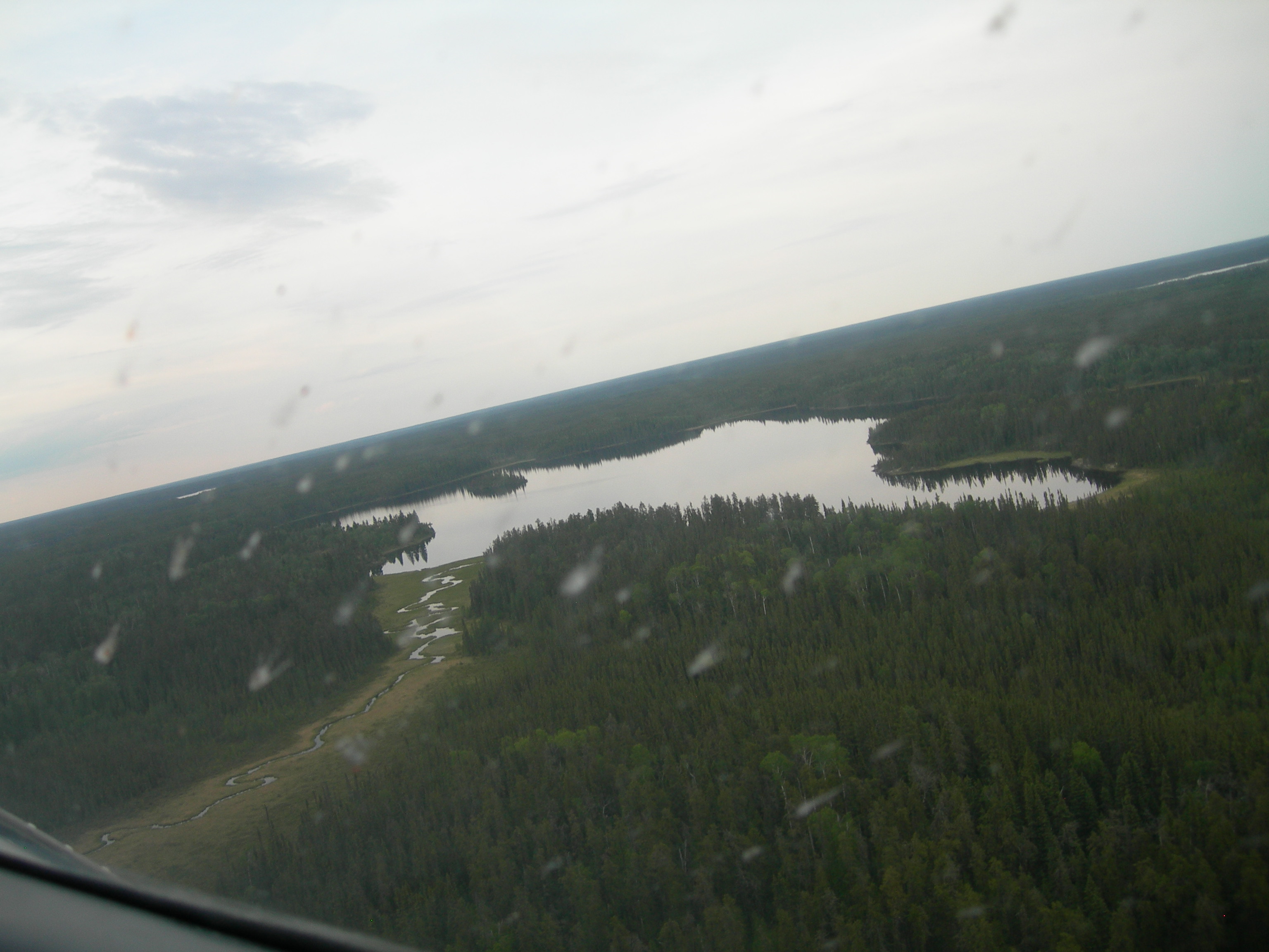 Pro jistotu celé jezero obkrouží a důkladně si jej prohlédne. Teď právě přelétáme nad průsekem uměle rozšířeným v ústí řeky. Vzsekali jej aby letadla mohla dosednout co nejdříve a hlavně pak startovat až do posledního kousíčku jezera. "Dráha" na jezeře je dlouhá jen asi 900 metrů a to je pro hydroplán nadoraz. V sezóně je tohle jezero jedním z oblíbených cílů Flin Flonských rybářů, ale sezóna začne až v červenci.