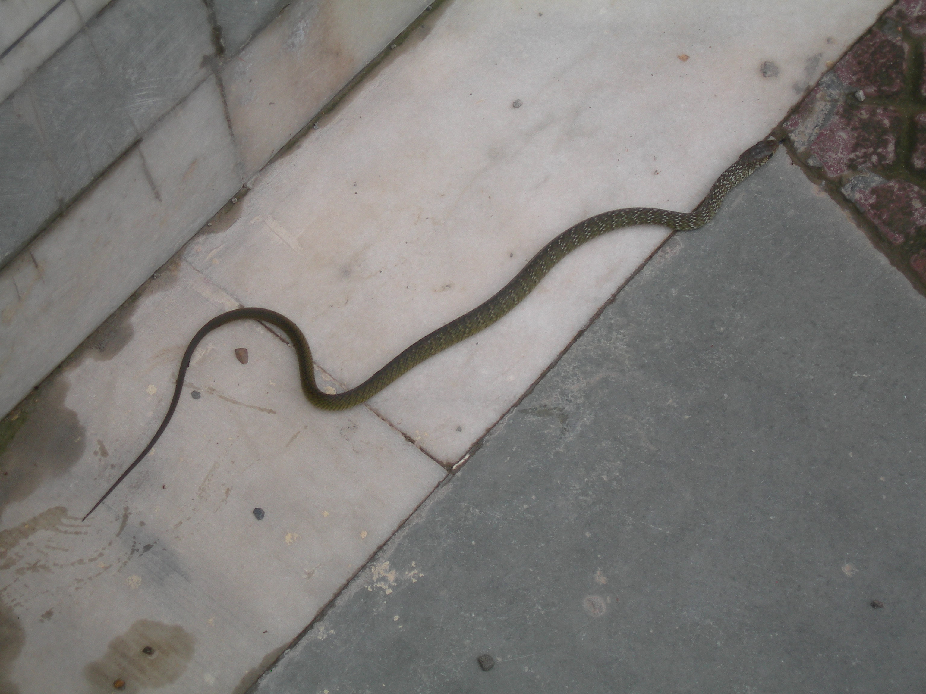 Při výstupu po mramorových schodech zpátky na parkoviště potkáváme tohohle hada jak ohromně šikovně sestupuje po schodech proti nám. Napřed ho fotím, pak se ptám našeho průvodce, o jakého hada se to jedná. Ten si zvíře důkladně prohlédl a pak zcela rozhodně vysvětlil: "Just a small snake".
